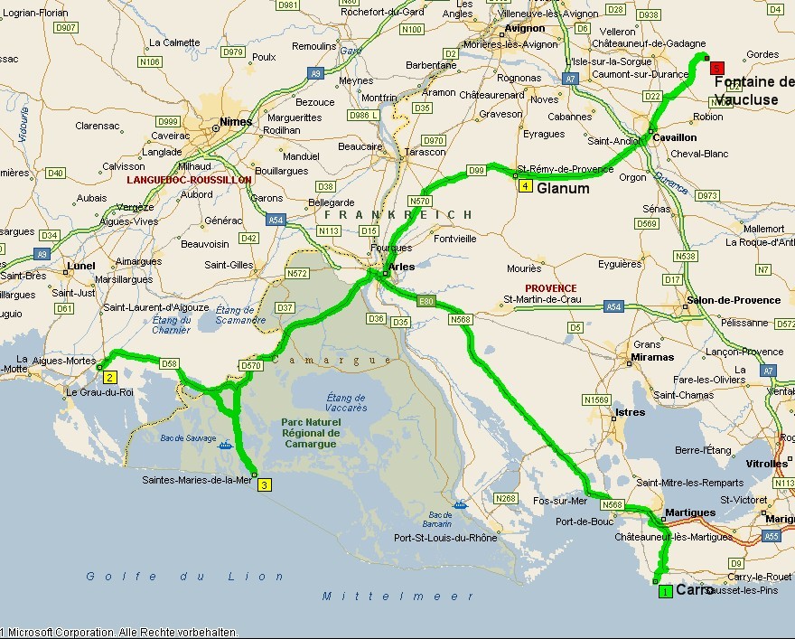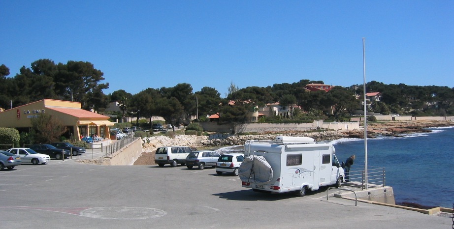 Unser Tagesziel war Carro, ein kleines Hafenstädtchen wo es laut unseren Unterlagen einen Stellplatz mit Ver- und Endsorgung geben sollte. Nach den Erfahrungen der vergangenen Tage näherten wir uns leicht pessimistisch dem Ort und wurden angenehm überrascht. Carro besitz einen sauber parzellierten Stellplatz für ca. 100 Mobile mit einer Ver- und Entsorgungsstation. Die Gebühr beträgt 5.5oEuro und wird an einer Schranke am Automaten entrichtet. Direkt am Strand und Hafen ruhig gelegen bietet dieser Ort die Möglichkeit von der Fahrerei auszuspannen. Carro selbst stellt kein touristisches Higlihght da, kann aber mit den wichtigsten Geschäften und einigen Restaurants aufwarten. Des weiteren finden sich hier viele Windsurfer ein die selbst bei ablandigem Mistral aufs Wasser gehen. Im Ort selbst kann man Windsurfzubehör erstehen.