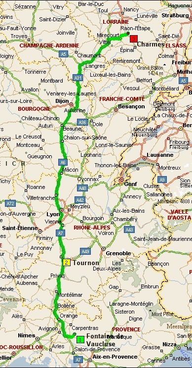 Am nächsten Tag begaben wir uns wieder in Richtung Heimat nach Norden. Wir verließen Fontaine de Vaucluse in Richtung Autobahn. An einer Abzweigung passierte es dann. Ich vernahm ein hässliches, rhythmisches Geräusch von unten und hielt sofort an. Die dicke Schraube die in dem Vorderreifen steckte war nicht zu übersehen. Es war eine kurze Blech-Schraube mit stumpfer Spitze. Ich drehte sie heraus und nun kam ein gewisser Stress auf. Nach ein paar Kilometern maß ich den Luftdruck (Luftdruckmesser hab ich immer dabei)und stellte keine Abweichung fest. Dies wiederholte ich nun regelmäßig. Hätte die Schraube in einem Hinterreifen gesteckt hätte ich den Reifen gewechselt (was wegen der Zugänglichkeit des Reserverads eine ziemliche Herausforderung gewesen wäre). Ein Reifenschaden mit Laufflächenschaden auf der Hinterachse bei voller Fahrt kann fatale Folgen haben. Neben starken Beschädigungen des Aufbaus (die Radkästen des Aufbaus bestehen im Allgemeinen aus Kunststoff)besteht durch Ausbrechen des Fahrzeugs Gefahr für Leib und Leben. Ein Schaden auf der Vorderachse ist schon eher beherrschbar. Bis zum Ende der Reise hat sich der Luftdruck jedenfalls nicht geändert. Ich werde den Reifen aber untersuchen lassen.