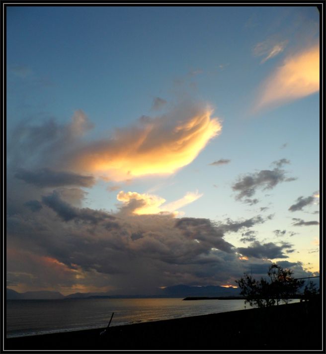 Am Abend erwischte uns doch noch ein leichter Regenschauer. Wir hatten es befürchtet denn Richtung Norden bauten sich im Verlaufe des Tages mächtige Gewitterwolken auf. Dort war das Wetter eindeutig schlechter als hier an der Küste. Zumindest wurde man für das Nass von oben durch einen farbenprächtigen Abendhimmel entschädigt.