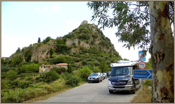 Wenn man vom Festland auf den Felsen zufährt hat man diesen Anblick. Hier sollte man auch sein Mobil parken. Der Ort ist zwar noch 1,5 km entfernt aber man bekommt dort vor dem Eingang zum unteren Dorf kaum einen Parkplatz, schon gar nicht mit einem Wohnmobil.