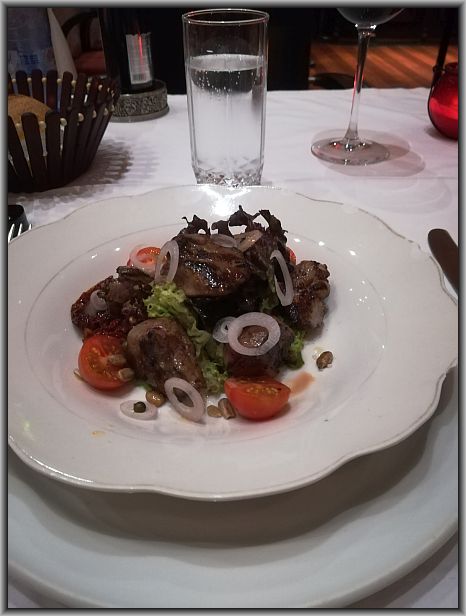 Gebratene Leber an Blattsalat mit Zwiebeln, Kirschtomaten und Pinienkernen: